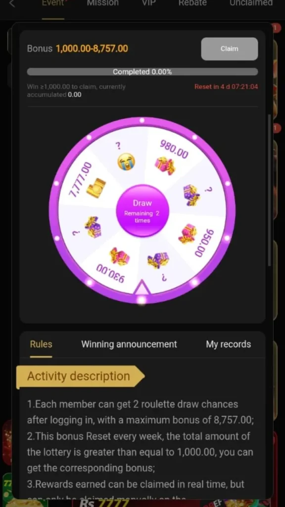 The lucky draw is a fun way to win without spending more. By playing daily or completing small tasks, you get a chance to enter. Prizes include free cash, bonuses, or even gifts. It’s like a surprise reward for being active in the game.